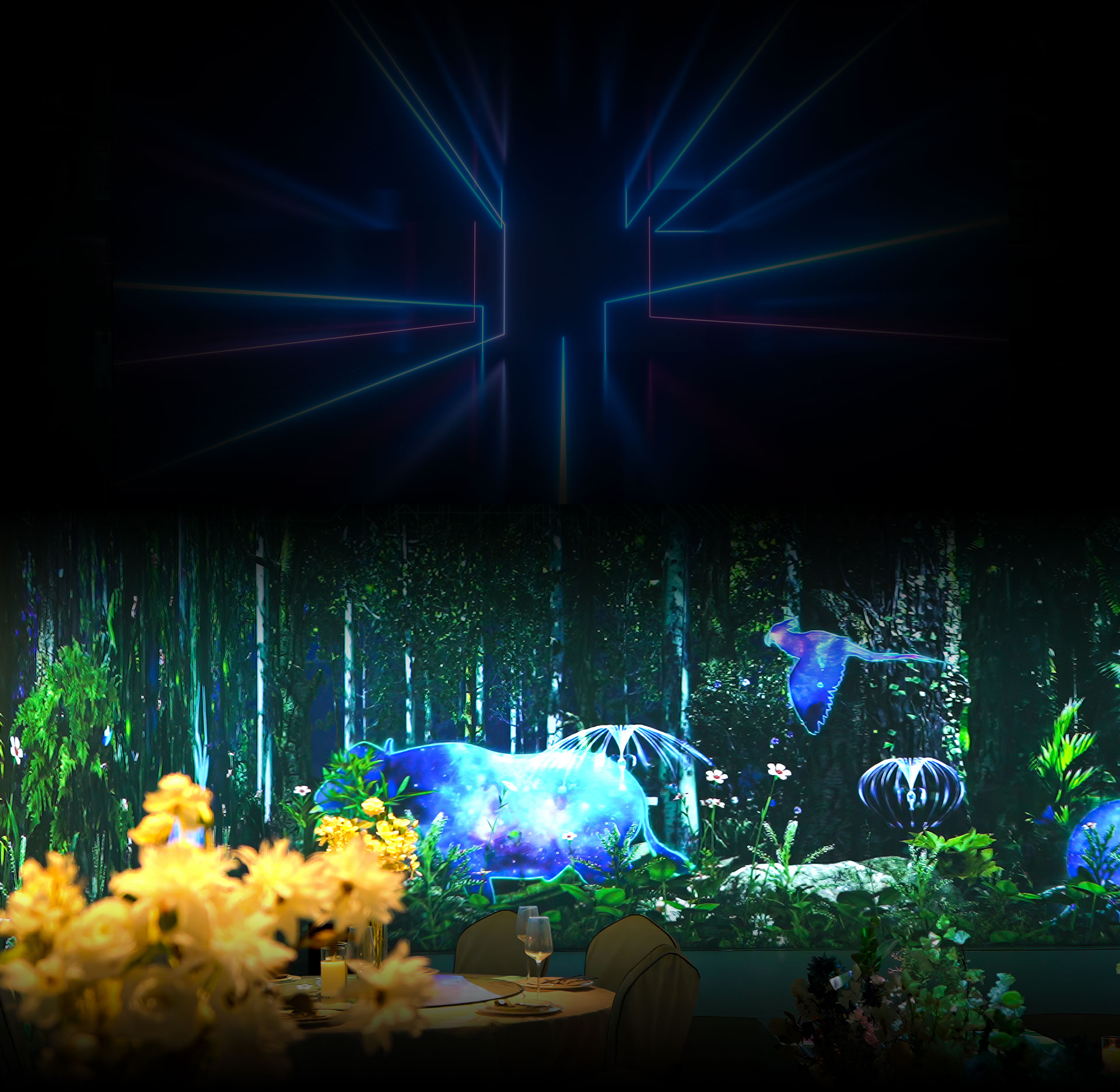 通过5D投影技术,以声、光、电及智能交互手段,专注于打造“沉浸式5D光影餐厅”和“5D全息光影宴会厅”。